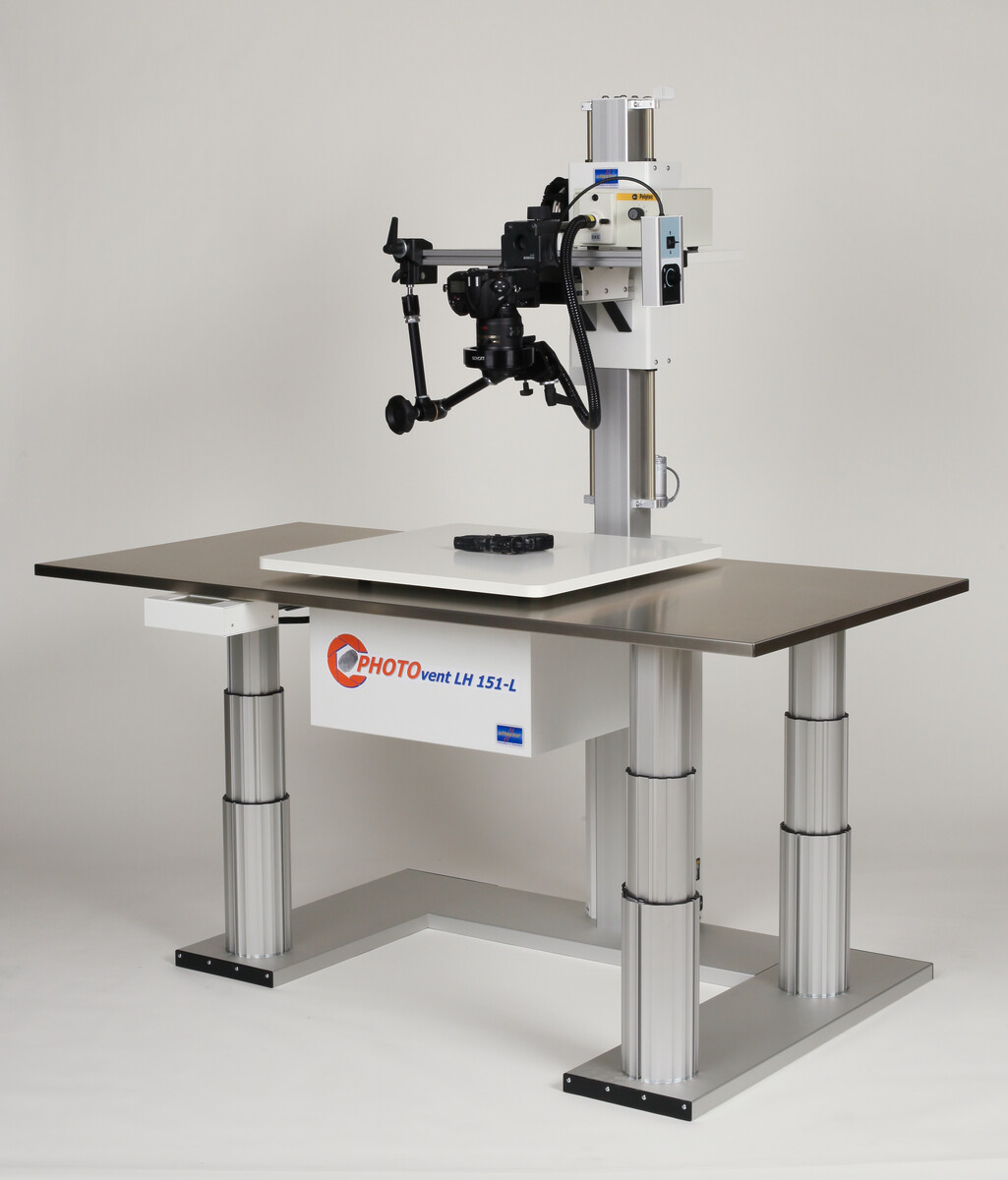 PHOTOvent LH151 allows motorized positioning of the camera via a cable remote control with coarse and high accurate fine positioning with an accuracy of approx. 0.3 mm. The accessories shelve with the integrated power outlets moves up and down with the camera arm to avoide blockages by cables or light guides. Also the working surface can be adjusted in height to accommodate different size of evidence while working in ergonomic position.