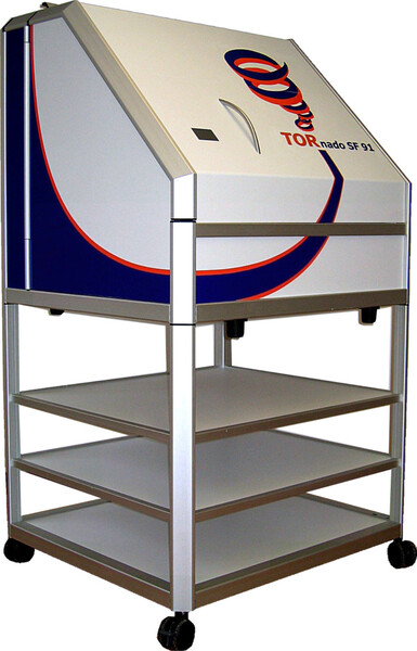 But not only during operation of the ESD, also in closed status in "stand-by", TORnado SF91 runs short filter cycles in regular intervals to create optimum conditions during storage. For cleaning or to collect stray cascade beats, a catch basin can be drawn out without lifting the heavy ESD equipment. TORnado SF91 features a microprocessor system which communicates with the user via a touch panel display in the lid. This runs a counter for the operating hours and informs the user when a filter change is due. If the maximum filter capacity is reached, TORnado SF91 automatically switches off the fan as well as the power supply of the ESD till a new filter is inserted. Unquestionable, TORnado SF91 is a useful contribution to health and safety at a document examiner's workplace.